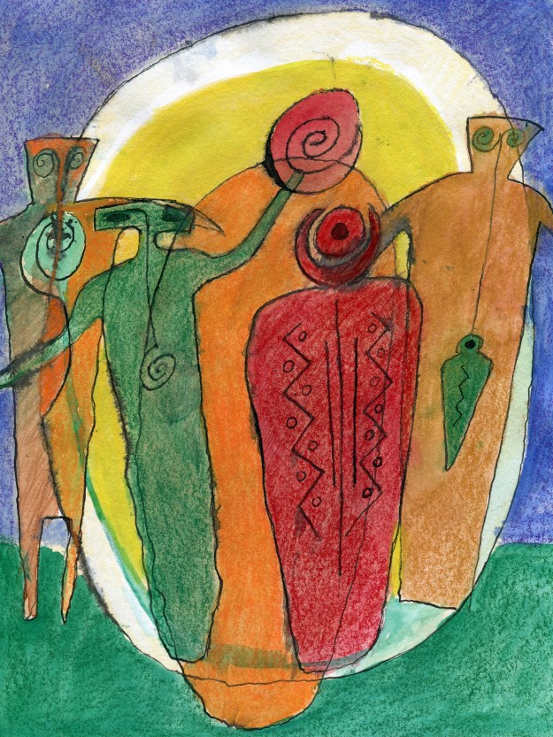 - “Two Spirits” – ink and acrylic on canvas – 18″ x 24″