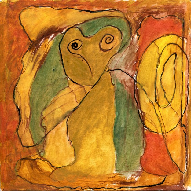 - “Sad Monk and Bird” – watercolor, ink on paper – 9″ x 12″